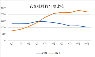 到10月底,挂牌数翻了3倍,达到2192个,是去年同期1036个的一倍多。