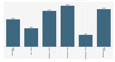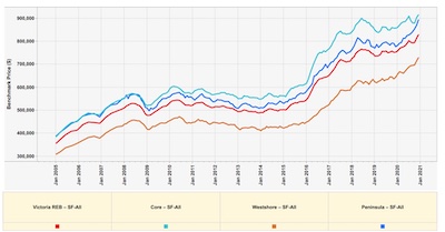 上图为大维各地区的价格变动,其中西岸地区(含Langford, Colwood)上涨13%,半岛地区(Sidney及码头等)全年上涨15%,各小岛的房产上涨仅4%左右。
